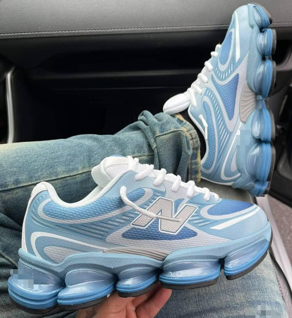 Level up your rotation with these eye-catching blue and white New Balance 9060-inspired chunky dad sneakers – the perfect blend of '90s retro-tech and modern street energy! The light blue dominant upper with wavy abstract overlays, crisp white accents, and bold white 'N' logo pops against breathable mesh panels, while the silver coil/spring-style laces add a futuristic high-tech twist. The thick ABZORB SBS blue gel pods in the midsole deliver plush cushioning and bounce, paired with a sculpted chunky platform sole for serious height and grip—ideal for Plumstead's chilly February streets or all-day comfort.