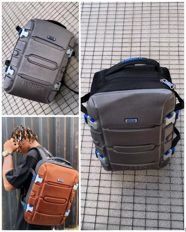 Stylish brown tactical backpack – hard-shell molded design with rugged paneling and buckles, perfect for Lagos street style, school, travel, or daily urban carry!