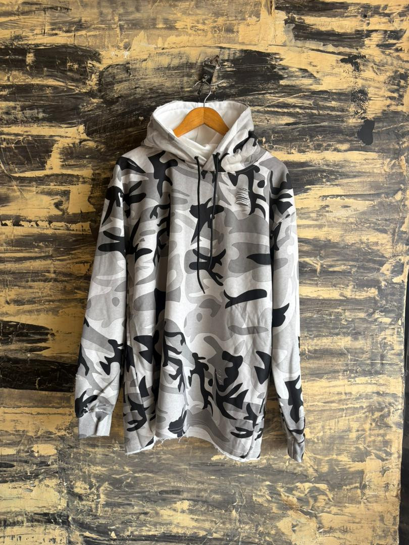 Level up your streetwear game with this gray black camo oversized hoodie! Bold abstract camouflage pattern in shades of gray and black on a soft fleece base – complete with distressed frayed/ripped hem for that edgy, lived-in vibe. Super cozy, relaxed fit perfect for layering or chilling.