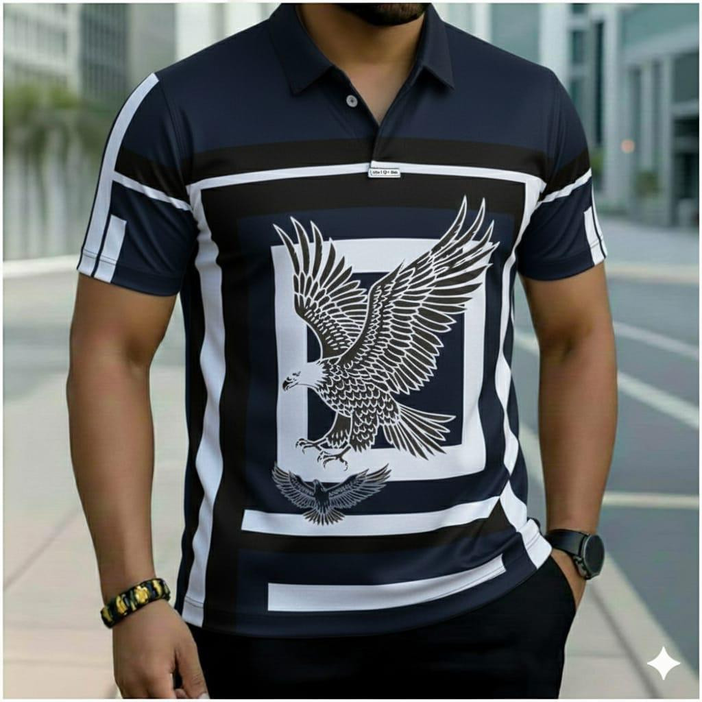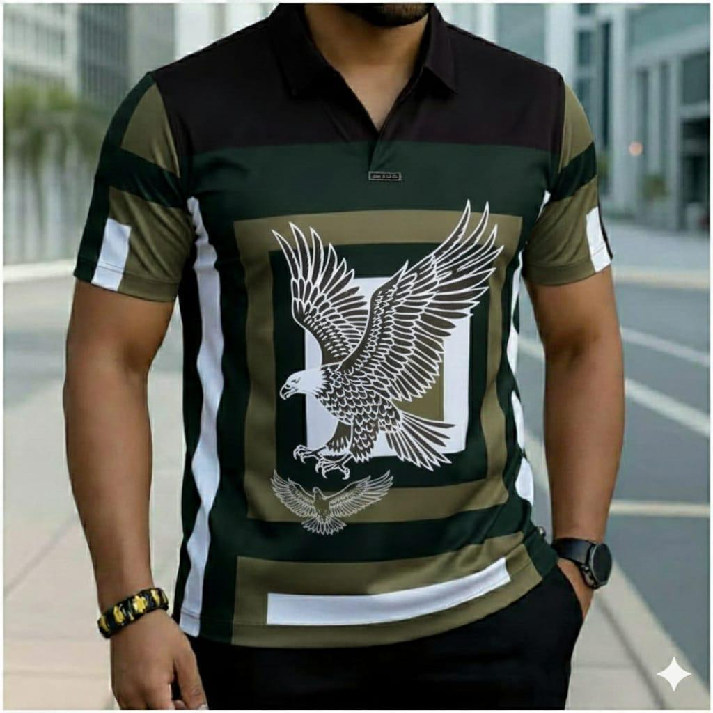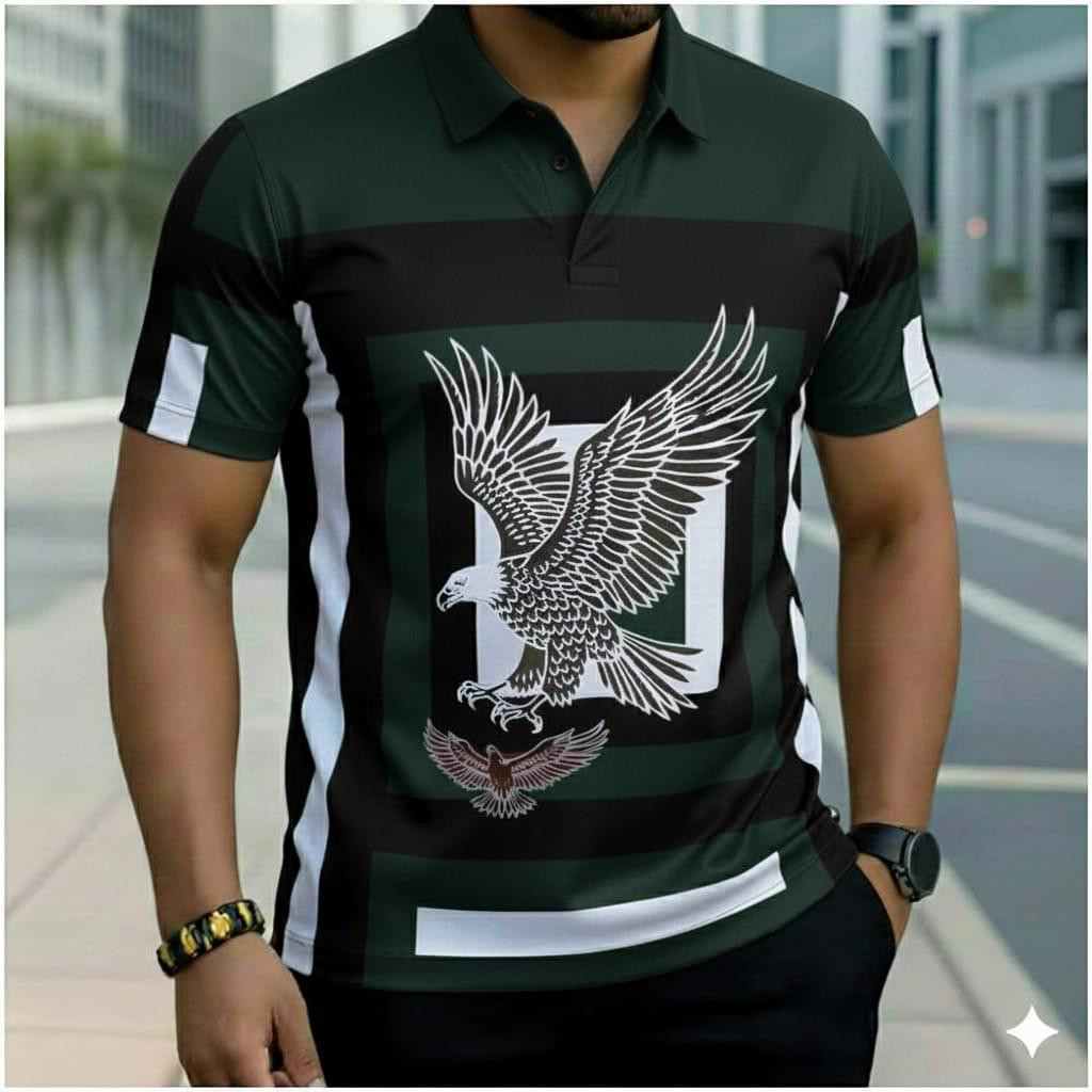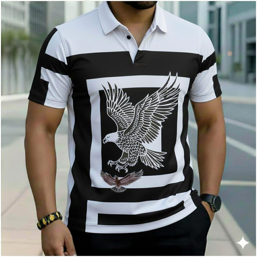 Make a bold statement with this ? maroon plaid polo! Rich burgundy/black check pattern with large white eagle graphic and scattered embroidery – short sleeve, collared, perfect for Lagos casual flex.