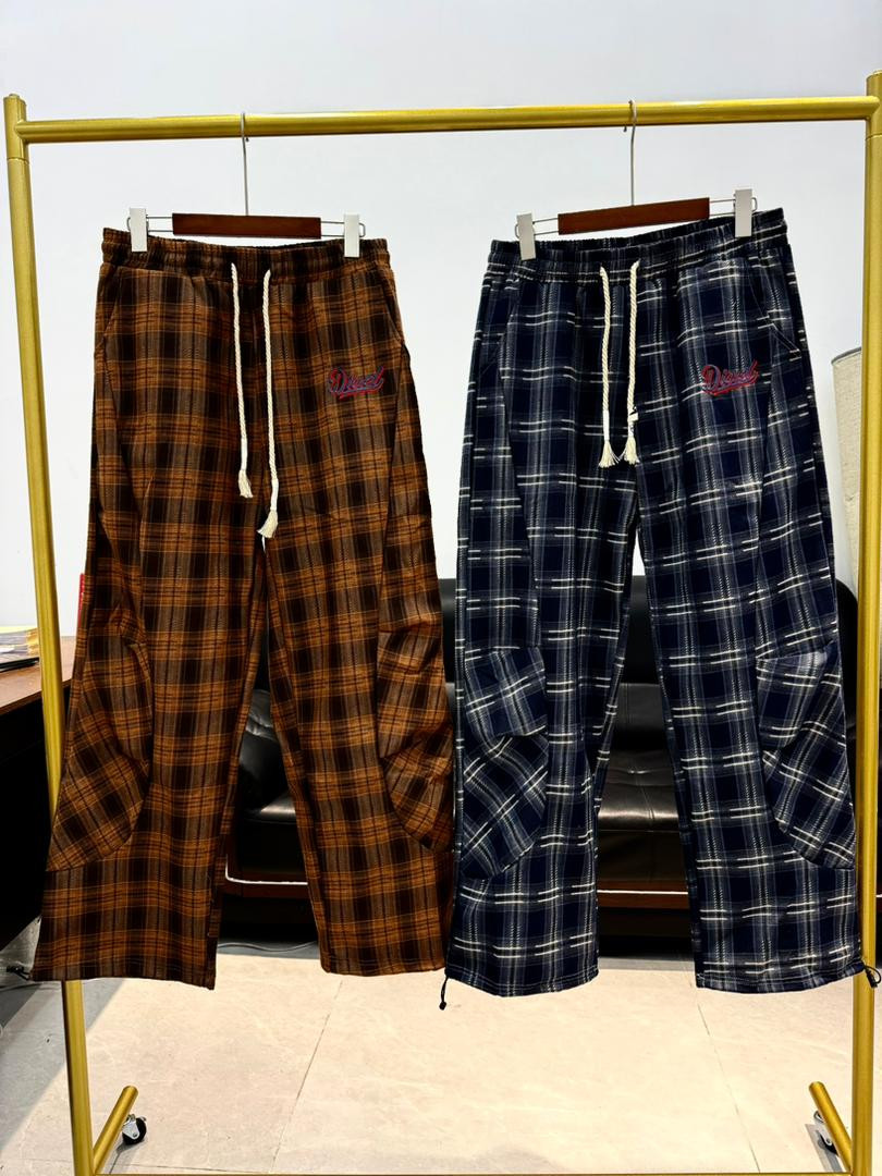 Cozy plaid vibes in these ? oversized lounge pants! Soft flannel-like cotton in brown/orange or navy/blue buffalo check with small "Dued" embroidery – ultimate relaxed homewear or casual street flex for Lagos.