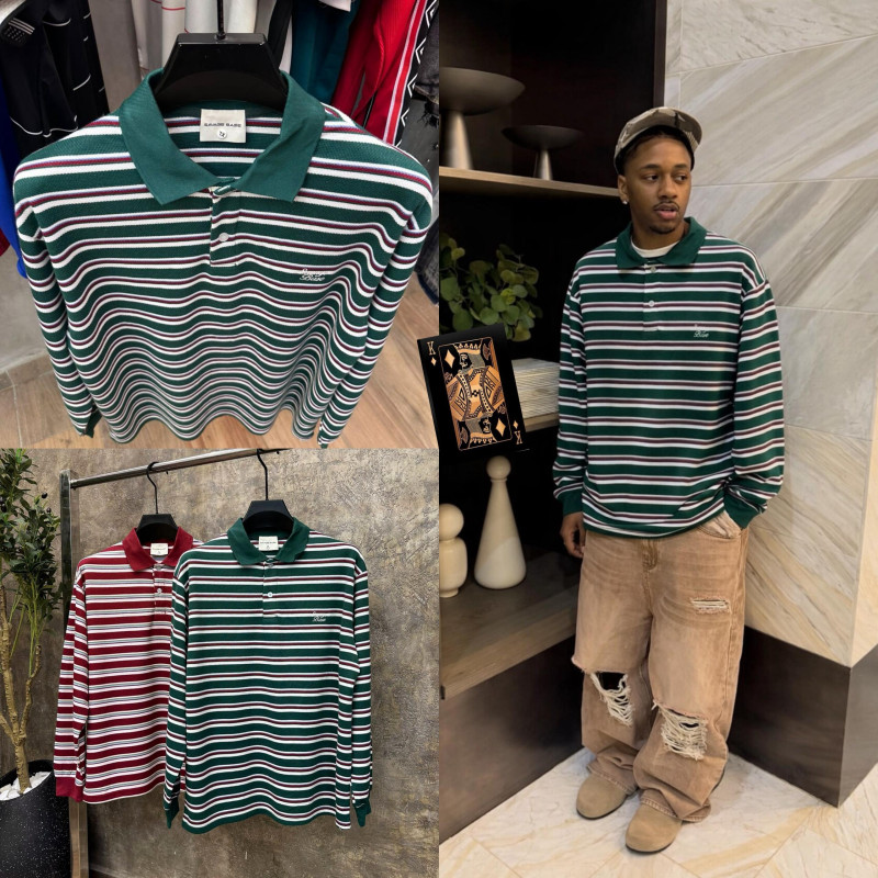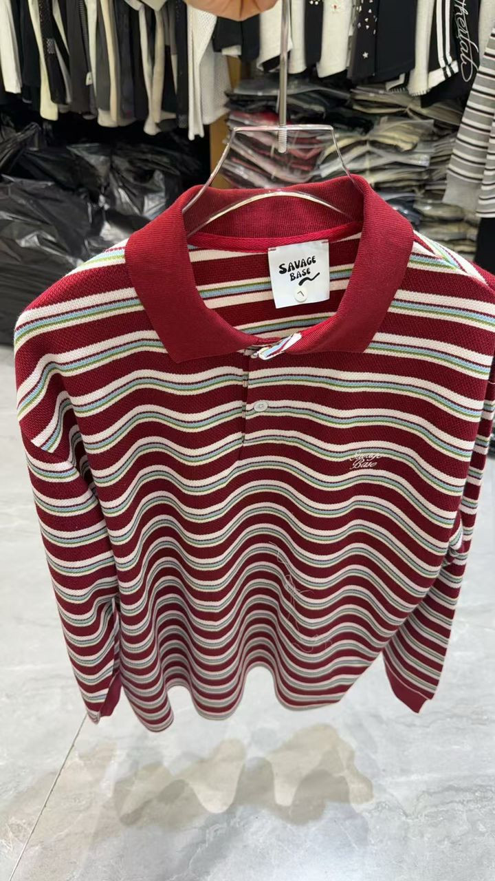 Upgrade your casual rotation with these ? Savage Base long-sleeve striped polos! Classic rugby-style in rich green or maroon with multi-color stripes – breathable cotton knit, contrast collar, and subtle embroidered logo for preppy streetwear vibes.