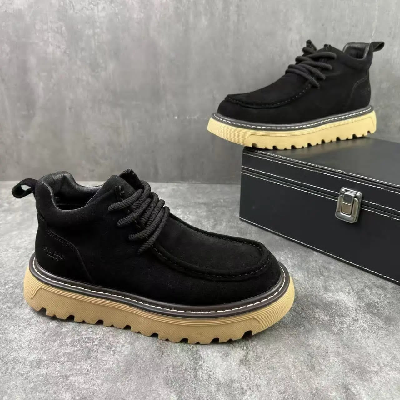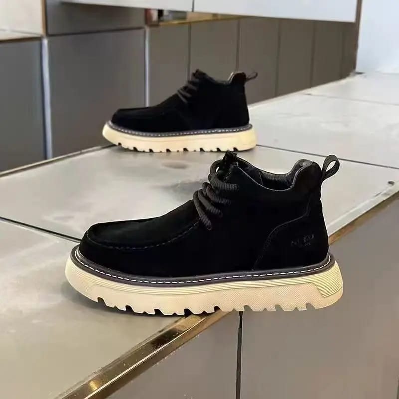 Rugged style meets comfort in these ? tan suede chunky ankle boots! Soft suede upper in warm tan with moc-toe stitching, yellow rope laces, and thick lug platform sole – bold streetwear vibe perfect for Lagos outfits.